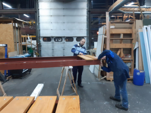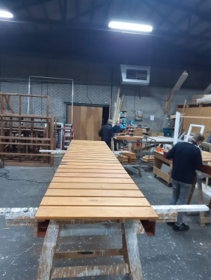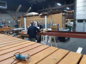 Stalenbalken en planken voorzien van gaten en vervolgens het geheel gemonteerd. De afspraak is gemaakt met Dirk Koldijk om de bruggen op te halen en te voorzien van een "ruwe laag" zodat de banden niet wegglijden als je er over heen fietst.